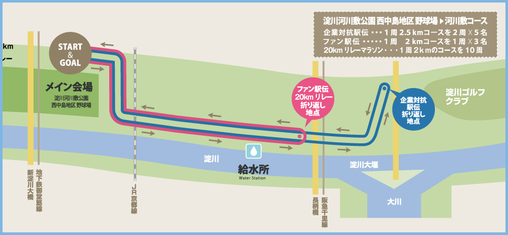 - 企業対抗駅伝2.5km(1人2周)、ファン駅伝2km(1人1周)、20kmリレーマラソン(1周2kmをチームで10周)
