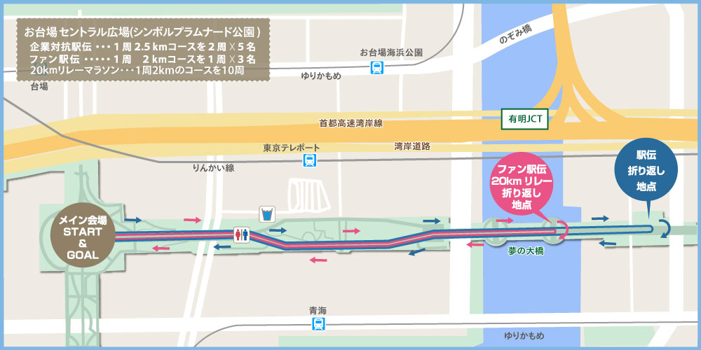 【受付時間】 07:00-08:10 受付 駅伝の部 男性部門 07:00-10:50 受付 駅伝の部 男女混合部門 12:00-13:40 受付 ファン駅伝の部 男性・男女混合部門 12:00-13:40 受付 20kmリレーマラソン ※各部門スタートの20分前までに受付をお済ませください。 (代表者のみで受付可能です。) 【企業対抗駅伝 タイムスケジュール】 07:00 受付 開始男性・男女混合部門(5km×5区間) 08:10 開会式 男性部門(5km×5区間) 08:30 スタート 男性部門(5km×5区間) 10:50 開会式 男女混合部門(5km×5区間) 11:10 スタート 男女混合部門(5km×5区間) 13:00 表彰式 (男性・男女混合部門合同開催) 13:50 競技終了 【企業対抗ファン駅伝 タイムスケジュール】 12:00 受付開始 男性・男女混合部門(2km×3区間) 13:40 開会式 男性・男女混合部門(2km×3区間) 14:00 スタート 男性・男女混合部門(2km×3区間) 14:30 表彰式 (男性・男女混合部門合同開催) 14:45 競技終了予定 【20kmリレーマラソン タイムスケジュール】 12:00 受付開始 男性・男女混合部門(2km×10周) 13:40 開会式 男性・男女混合部門(2km×10周) 14:00 スタート 男性・男女混合部門(2km×10周) 15:30 表彰式 (男性・男女混合部門合同開催) 16:30 競技終了予定 17:00 会場内コンテンツ終了(更衣室など) ※スケジュールは変更となる場合がございます。 |