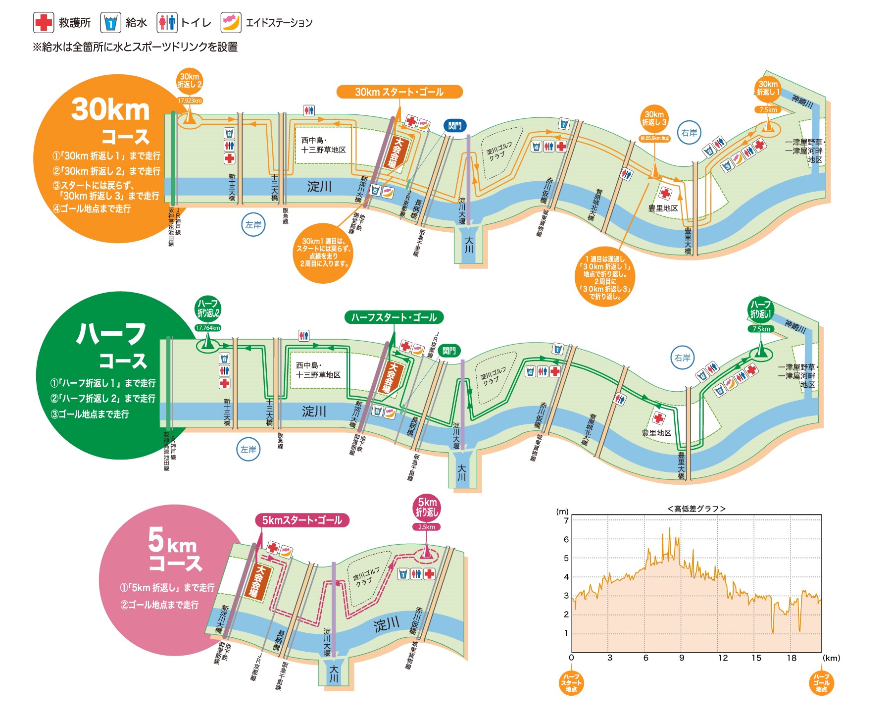 30km、ハーフ、5km