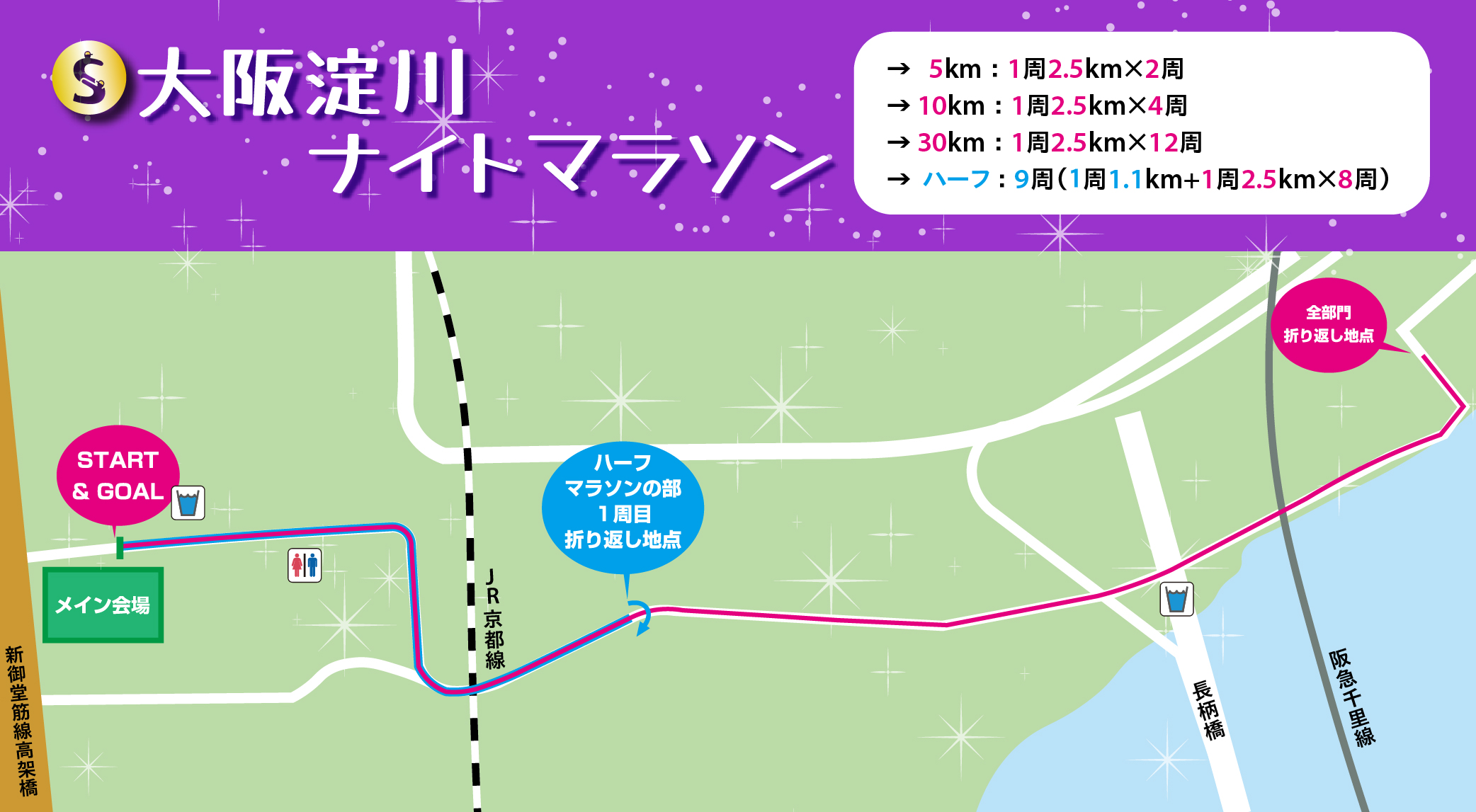 | スケジュール | 受付時間:16:30〜18:10 開始時間:18:00 終了時間:22:00 【タイムスケジュール】 16:30 受付開始 17:45 ハーフマラソンの部 開会式 18:00 ハーフマラソンの部 スタート 18:15 5kmの部・10kmの部・30kmの部 開会式 18:30 5kmの部・10kmの部・30kmの部 スタート 22:00 競技終了 ※各部門スタート20分前まで受付をすませてください。 ※各部門スタート15分前に競技説明を行います。 ※スケジュールは変更になる場合がございます。 |