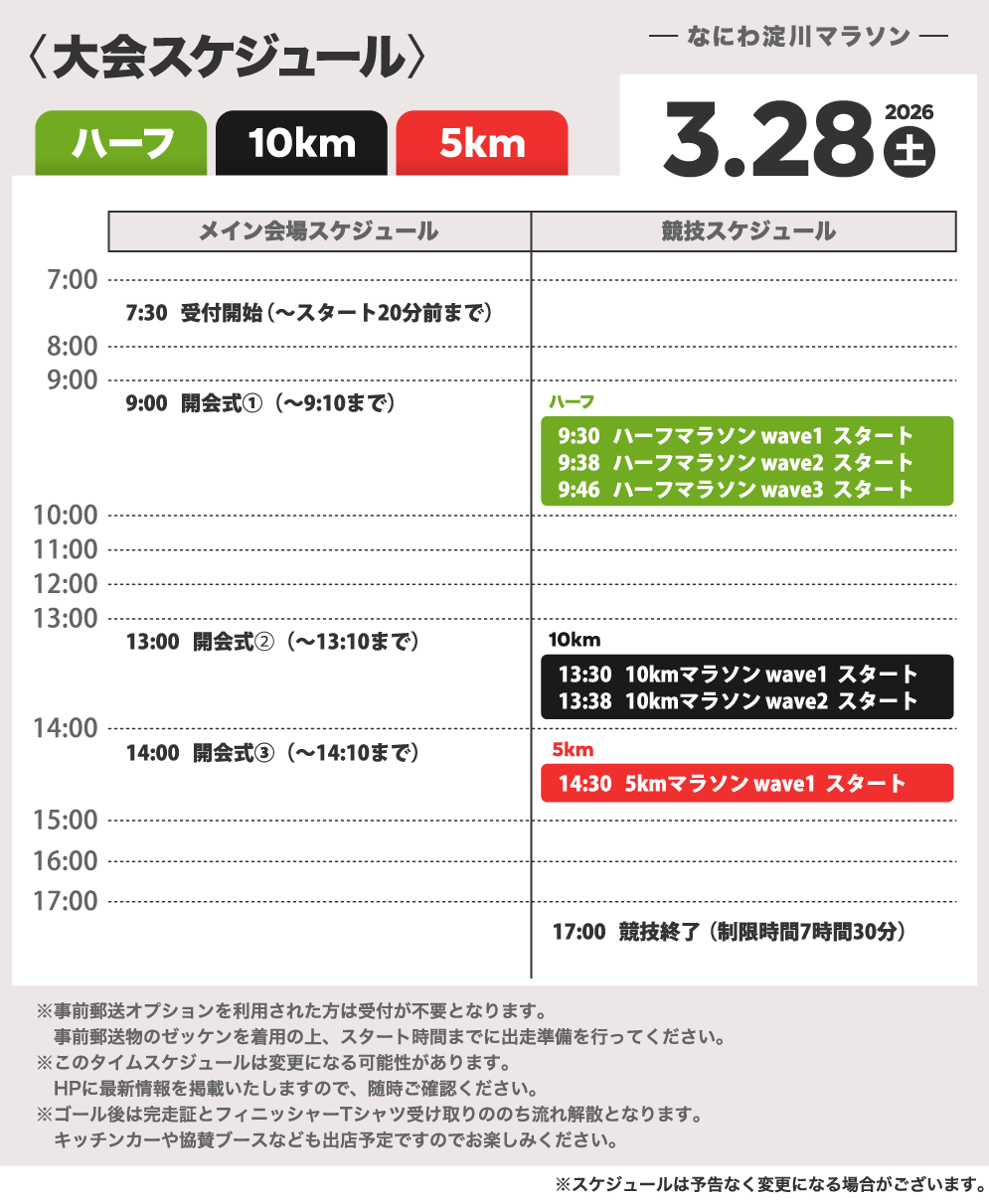 ※他の参加者と一緒に参加されたい場合など、ウェーブ時間は調整いただいても問題ございません。但し、カテゴリーの変更は出来かねますのでご了承ください。