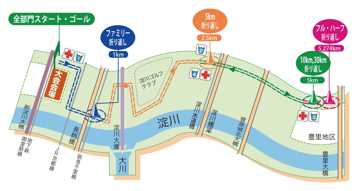 【ファミリーランの部】 :2kmのコースを1周【5kmの部】 :5kmのコースを1周【10㎞の部】 :10kmのコースを1周【ハーフマラソンの部】 :約10.548kmのコースを2周【30kmの部】 :10kmのコースを3周【フルマラソンの部】 :約10.548kmのコースを4周